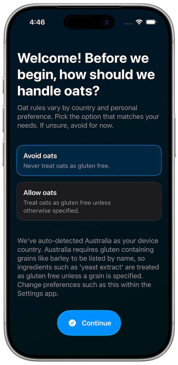 If you are newly diagnosed, it is usually recommended to avoid oats at first, then reintroduce them later only if allowed in your region and approved by your healthcare provider. If you use our app, start with this setting initially:
